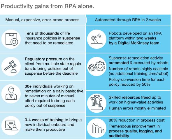 左列:人工完成,昂貴,易錯(cuò)。數(shù)以萬(wàn)計(jì)的人身保險(xiǎn)等待處理,deadline前的管理壓力,30余位員工處理日常工作,每個(gè)員工需要3-4周的培訓(xùn)。右列:兩周時(shí)間搭建RPA平臺(tái),待解決的工作被機(jī)器人自動(dòng)執(zhí)行,熟練的人力資源被應(yīng)用在高價(jià)值的工作中,人為失誤減少,處理成本降低80%,并極大的提高了質(zhì)量。 一家大型金融機(jī)構(gòu)大規(guī)模RPA轉(zhuǎn)型,自動(dòng)完成60%-70%的記錄和報(bào)告的工作,達(dá)成了30%或更高的年運(yùn)行率效率。使用相同的方法,另一個(gè)機(jī)構(gòu)在額外排隊(duì)過(guò)程中實(shí)現(xiàn)了80%的處理成本減少。FT500中的另一家金融機(jī)構(gòu),使用機(jī)器人技術(shù),每年降低了1.75億英鎊的成本,并節(jié)省了120多FTE。