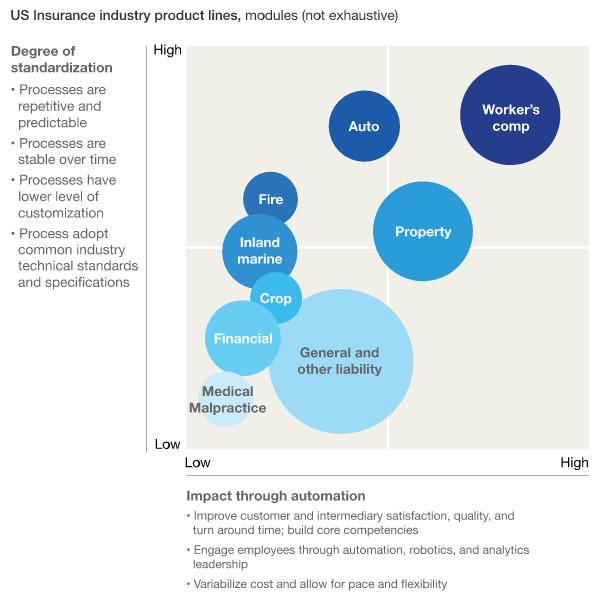 任何IPA應(yīng)用都是短期利益與更大的長(zhǎng)期發(fā)展相結(jié)合的。應(yīng)該根植于對(duì)產(chǎn)品的特點(diǎn),與是否適合自動(dòng)化,來(lái)重新設(shè)計(jì)并構(gòu)建詳細(xì)的路線圖,并重新設(shè)想團(tuán)隊(duì)?wèi)?yīng)該以何種方式工作來(lái)創(chuàng)造價(jià)值。 例如,每個(gè)保險(xiǎn)產(chǎn)品線都有不同程度的標(biāo)準(zhǔn)化和自動(dòng)化潛力,需要對(duì)他們進(jìn)行考察(如圖2)。一些時(shí)間密集型工作例如銷售,承保和定價(jià),政策管理,索賠和財(cái)務(wù)等,就很適合使用IPA,當(dāng)決定這些工作未來(lái)都如何進(jìn)行之后,就從頭開(kāi)始構(gòu)建。
